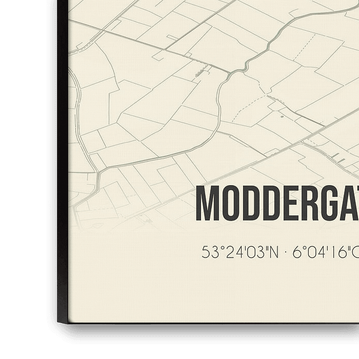 Carte rétro de Moddergat, située dans la commune de Noardeast-Fryslan, province de Fryslan. La carte montre les routes publiques, les cours d'eau (lacs, ruisseaux et fossés) et les forêts dans et autour de Moddergat. En outre, la carte contient les coordonnées de Moddergat.