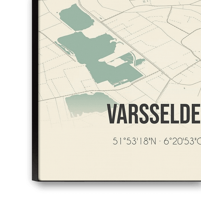 Carte rétro de Varsselder, située dans la région de Liemers, dans la commune de Oude IJsselstreek, province de Gelderland. La carte montre les routes publiques, les cours d'eau (lacs, ruisseaux et fossés) et les forêts dans et autour de Varsselder. En outre, la carte contient les coordonnées de Varsselder.