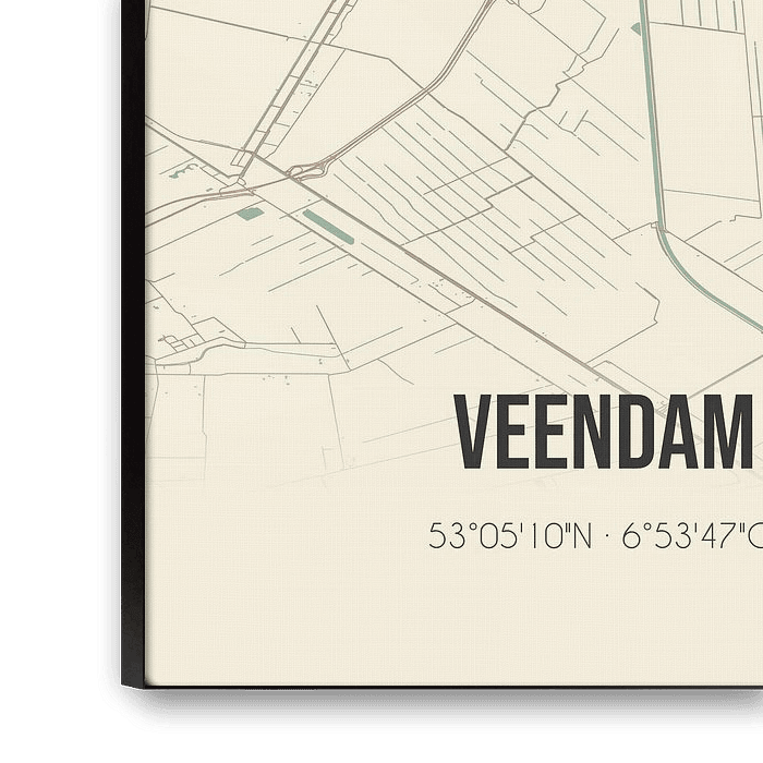 Carte rétro de Veendam, située dans la commune de Veendam, province de Groningue. La carte montre les routes publiques, les cours d'eau (lacs, ruisseaux et fossés) et les forêts dans et autour de Veendam. En outre, la carte indique les coordonnées de Veendam.