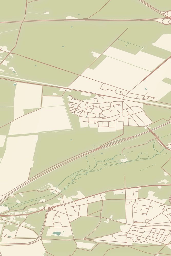 Carte rétro de Wolfheze, située dans la vallée de Gelderse, dans la municipalité de Renkum, province de Gelderland. La carte montre les routes publiques, les cours d'eau (lacs, ruisseaux et fossés) et les forêts dans et autour de Wolfheze. En outre, la carte indique les coordonnées de Wolfheze.