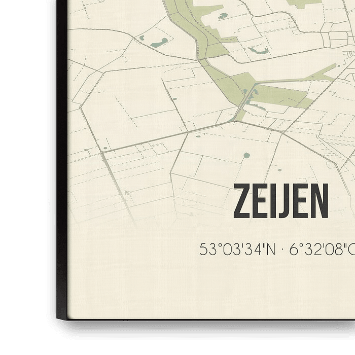 Carte rétro de Zeijen, située dans la commune de Tynaarlo, province de Drenthe. La carte montre les routes publiques, les cours d'eau (lacs, ruisseaux et fossés) et les forêts dans et autour de Zeijen. En outre, la carte contient les coordonnées de Zeijen.