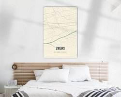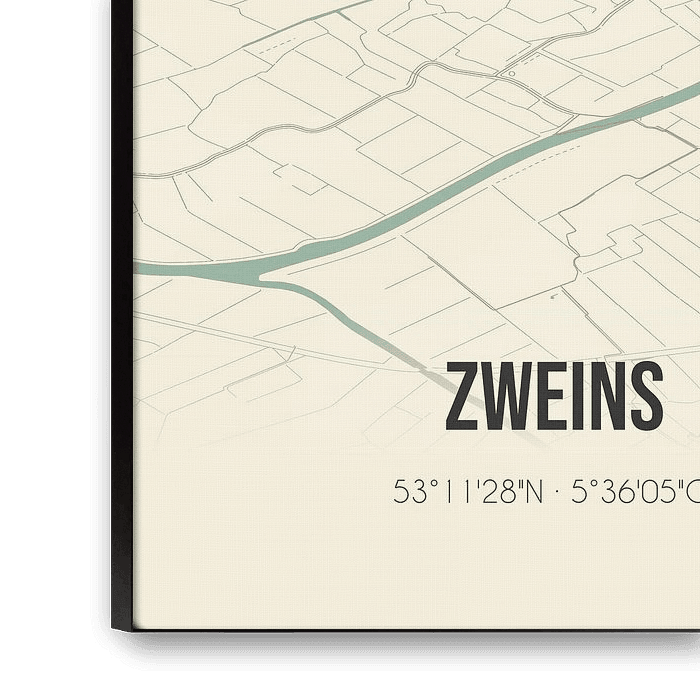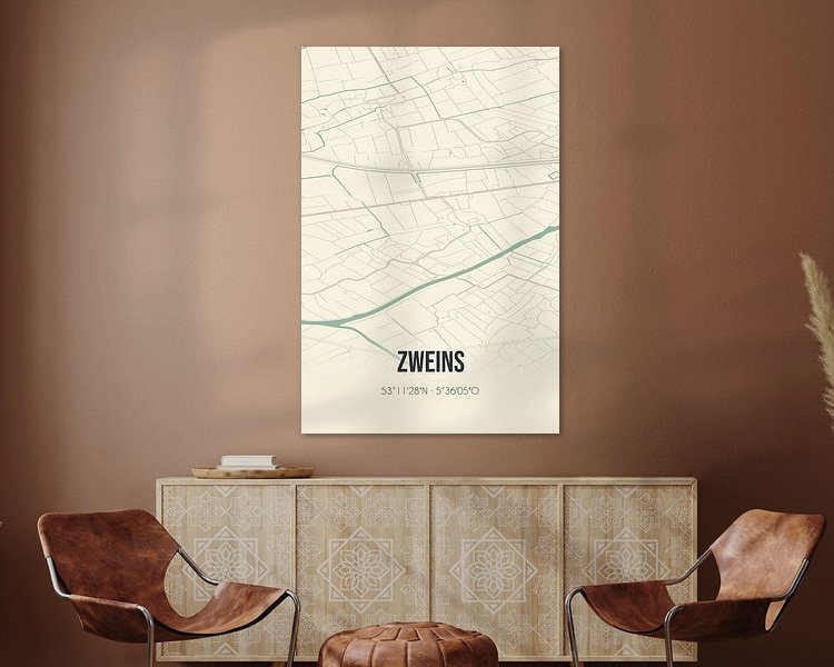 Carte rétro de Zweins, située dans la commune de Waadhoeke, province de Fryslan. La carte montre les routes publiques, les cours d'eau (lacs, ruisseaux et fossés) et les forêts dans et autour de Zweins. En outre, la carte contient les coordonnées de Zweins.
