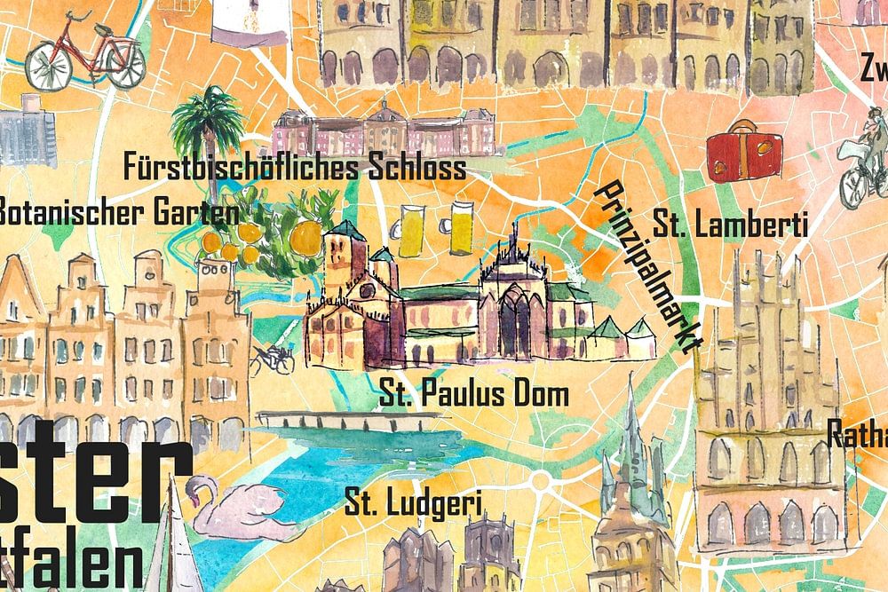 Carte d'illustration de Münster-Westphalie avec les rues et les points forts touristiques par Markus Bleichner