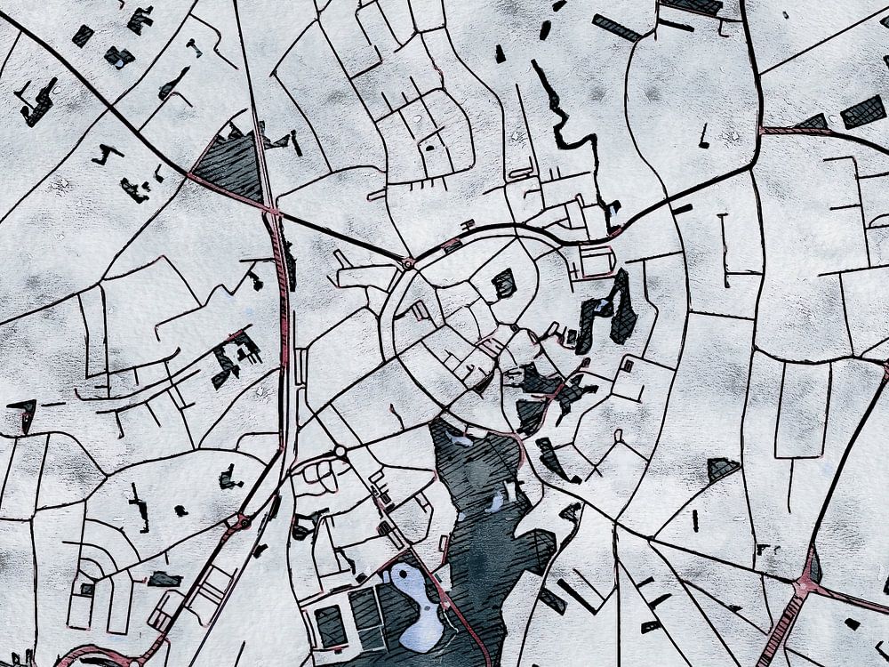 Cette carte de Bilzen a été faite à partir de notre style sur mesure "White Winter". Les rues rouge Bordeaux serpentent comme des veines à travers le paysage hivernal. Une épaisse couche de neige blanche recouvre les champs et la ville, tandis que la végétation a perdu ses feuilles et se prépare au printemps dans l'obscurité. Cette carte hivernale de Bilzen donne un nouveau look à votre intérieur.