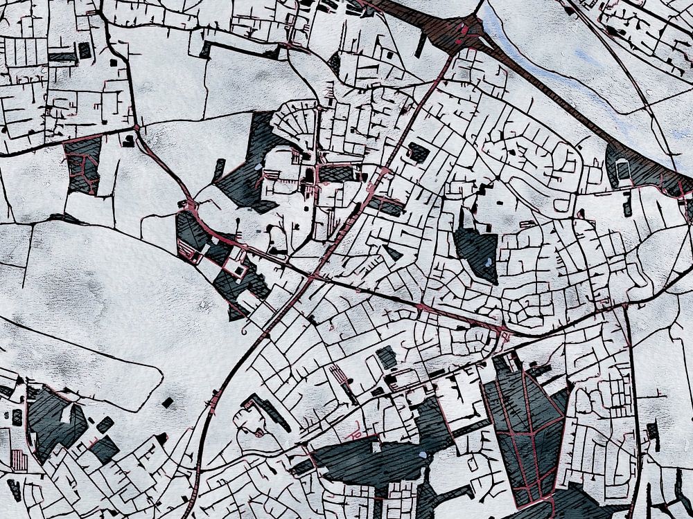 Cette carte de Sankt Augustin a été faite à partir de notre style sur mesure "White Winter". Les rues rouge Bordeaux serpentent comme des veines à travers le paysage hivernal. Une épaisse couche de neige blanche recouvre les champs et la ville, tandis que la végétation a perdu ses feuilles et se prépare au printemps dans l'obscurité. Cette carte hivernale de Sankt Augustin donne un nouveau look à votre intérieur.