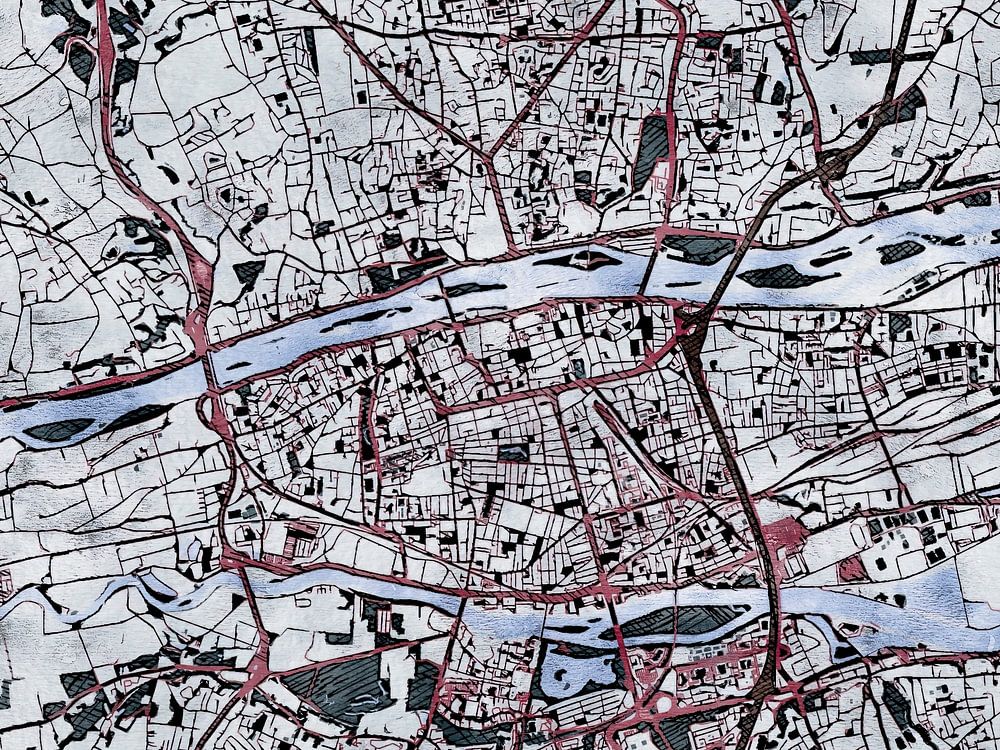 Cette carte de Tours a été faite à partir de notre style sur mesure "White Winter". Les rues rouge Bordeaux serpentent comme des veines à travers le paysage hivernal. Une épaisse couche de neige blanche recouvre les champs et la ville, tandis que la végétation a perdu ses feuilles et se prépare au printemps dans l'obscurité. Cette carte hivernale de Tours donne un nouveau look à votre intérieur.