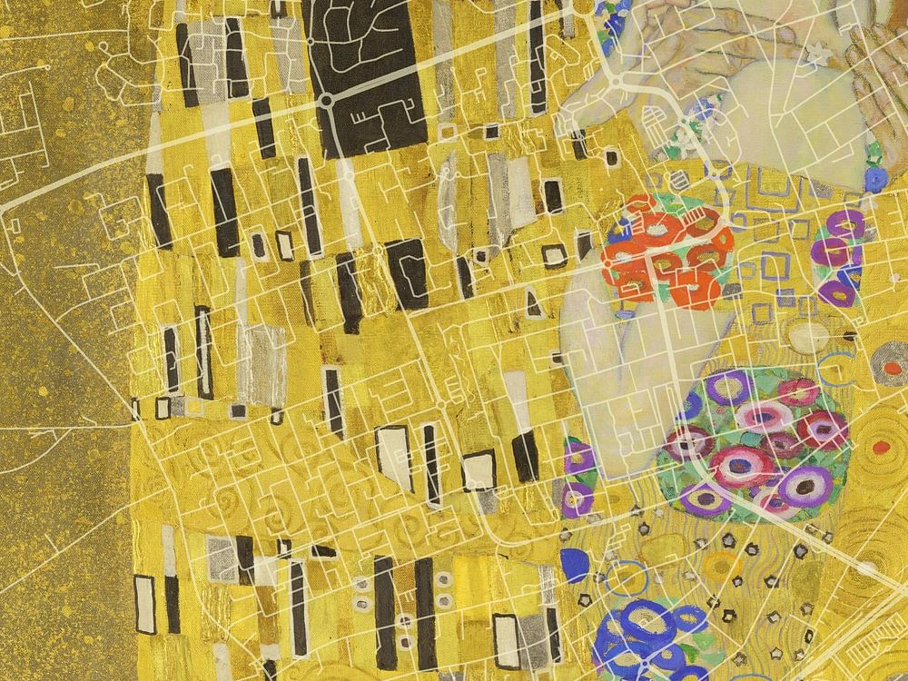 La carte de Veldhoven est intégrée dans le tableau Le Baiser de Gustav Klimt. Que vous ayez un appartement moderne ou une maison classique, cette œuvre d'art apporte la beauté du centre de Veldhoven dans votre intérieur et donne une touche artistique à votre espace.
