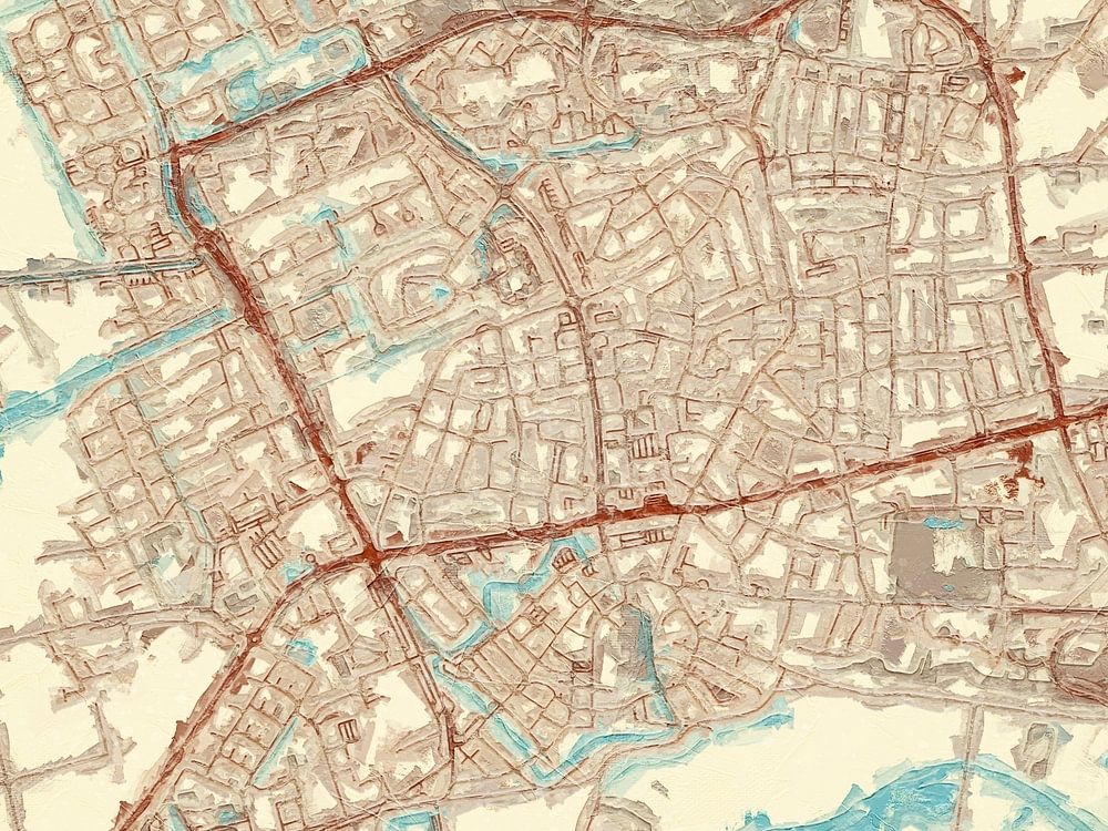 Nous présentons ici une carte d'Wageningen dans le style Bleu & Crème. Cette peinture numérique met en valeur un fond crème, symbolisant la tranquillité, tandis que les nuances de bleu clair représentent les voies navigables et les routes rouges vives mettent en évidence les rues de la ville.