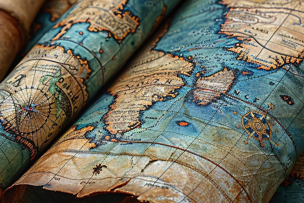 Créez une atmosphère aventureuse dans votre bureau avec cette carte du monde enroulée sur une table en bois. Parfait pour les rêveurs et les voyageurs !