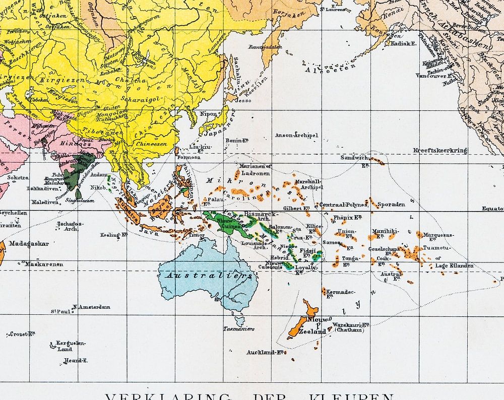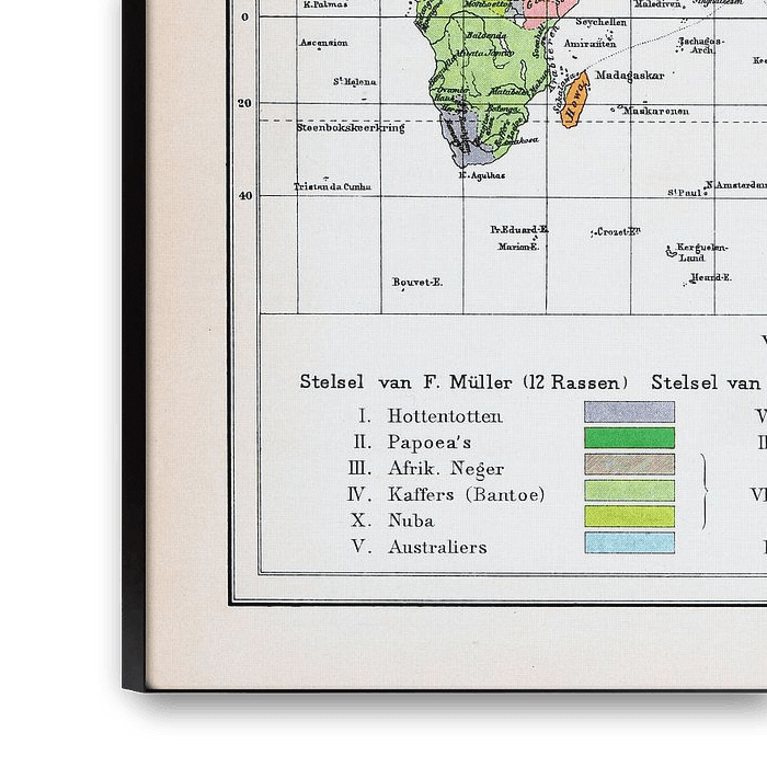 Cette ancienne carte du monde datant d'environ 1900 montre la répartition des races humaines dans le monde. Au début du 20e siècle, il existait plusieurs systèmes d'étude des races. Cette carte montre le système de F. Müller (12 races) et celui de O. Peschel (7 races).