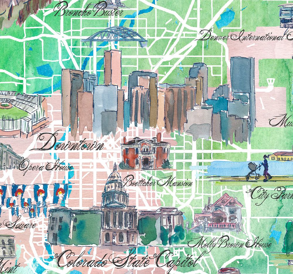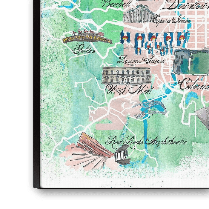 Acheter ce tableau Carte illustrée de Denver Colorado USA avec les curiosités et les points forts des principales route par Markus Bleichner sur toile, aluminium, ArtFrame ou photographie (encadrée), impression d'art en haute qualité et tout format.