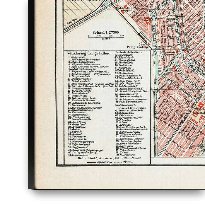 Cette carte ancienne datant d'environ 1900 montre un plan de la ville d'Amsterdam. Ce plan est en couleur. Il comprend une liste des bâtiments et monuments les plus importants.