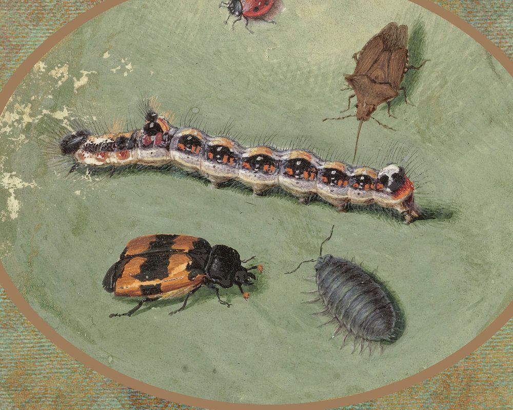 Une chenille, une coccinelle, un cloporte, une punaise et un scarabée.