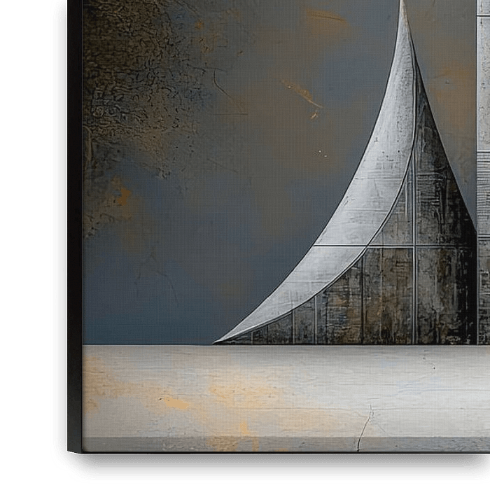 Dans la partie centrale, on distingue plusieurs grilles géométriques disposées en orange vif, qui forment un entrelacement semblable à un labyrinthe. Ce détail donne l'impression que tous les principes de construction d'une civilisation étrangère peuvent être réunis ici. Le gris-brun dominant de l'arrière-plan sert de cadre discret et souligne ainsi l'aura de l'élément circulaire ainsi que la présence anguleuse des hautes tours.