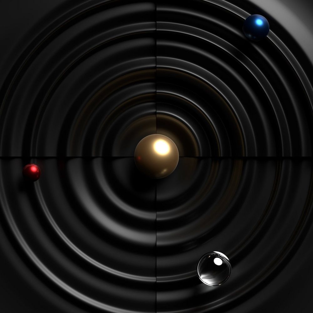 Image minimaliste avec des anneaux concentriques de segments de vagues et de sphères.