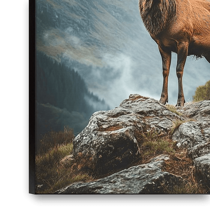 Un cerf majestueux trône, solide comme un roc, sur son piédestal naturel, tandis que ses impressionnants bois ramifiés se dressent fièrement vers le ciel. Entouré de montagnes dramatiques et d'un fond de brume mystique, il dégage une aura de calme et d'autorité, comme s'il était le maître de cette nature sauvage et intacte.