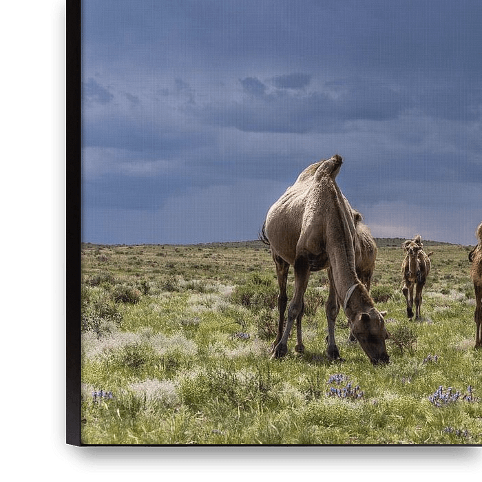 Un troupeau de chameaux dans la steppe de Mongolie avec un ciel de pluie sombre qui brille au travers du soleil.