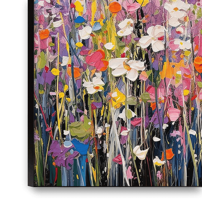 Cette peinture joyeuse montre un champ de fleurs printanières colorées en pleine floraison. L'ensemble de la composition semble danser sous l'effet d'une brise légère, ce qui donne aux fleurs une impression de mouvement et de vie. La palette de couleurs est riche et variée, avec des tons de jaune vif, d'orange profond, de rose tendre, de violet vibrant et de vert frais mélangés.