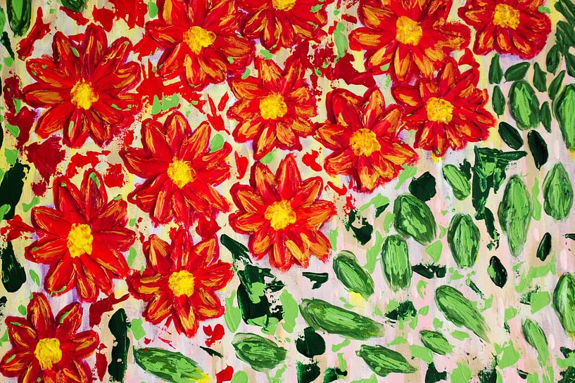 Un mélange énergique de rouge vif et de jaune pour les fleurs, complété par diverses nuances de vert et des taches de blanc et de rose pâle à l'arrière-plan.