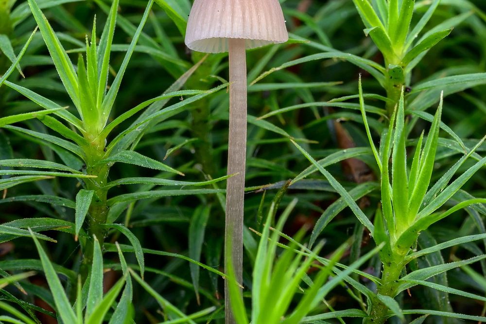 Un petit champignon pousse au début de l'hiver dans une "forêt" de mousse.