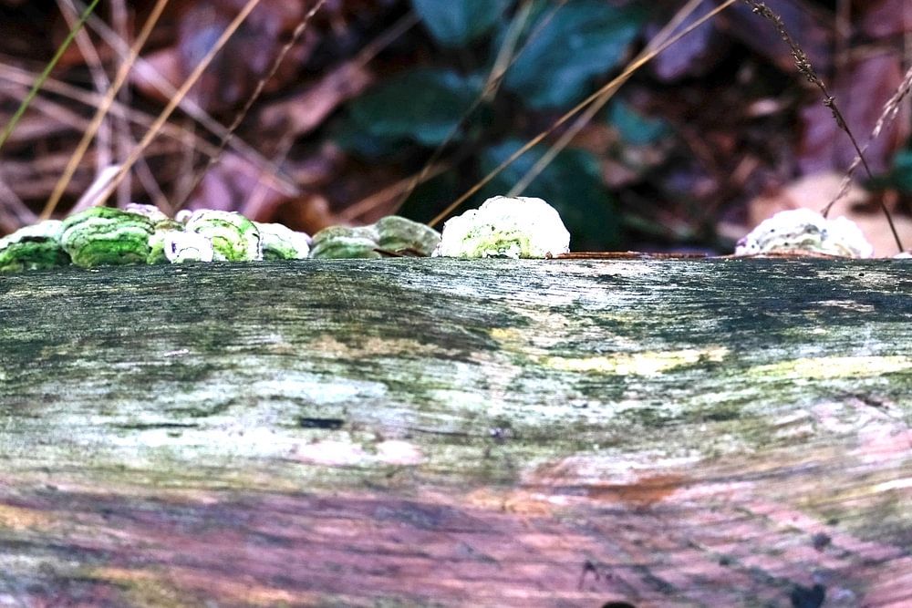 Des champignons poussent sur un arbre tombé. La photo est centrée sur les champignons. L'image est en quelque sorte divisée en deux par l'arbre. Les feuilles et les branches sont visibles en haut de l'image, tandis que l'arbre se trouve en bas.