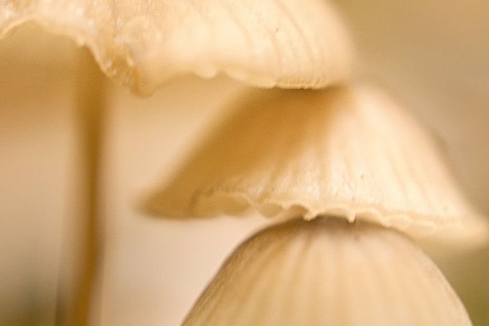Des champignons filigranes et délicats sur le sol de la forêt. Aiguilles de sapin et mousse sur le sol. Les champignons sont détachés, avec bokeh.