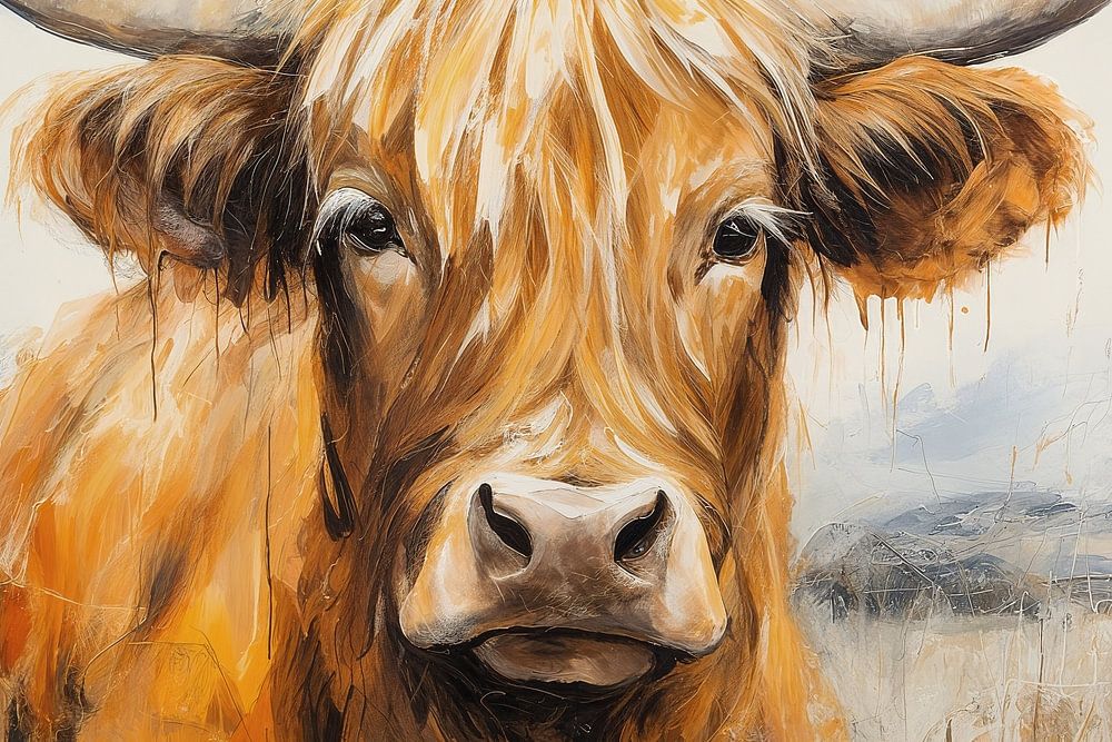 Charisme rustique - Highlander écossais - Le tableau représente un Highlander écossais luxuriant, brun orangé, dont les cornes impressionnantes et le regard amical attirent immédiatement l'attention. Le style alterne entre des détails réalistes sur le visage de la vache et des touches libres et expressives à l'arrière-plan, créant ainsi un contraste dynamique. Les couleurs utilisées sont un mélange de tons chauds de la terre sur un fond neutre, quelque peu abstrait, avec des touches de bleu et de blanc.
