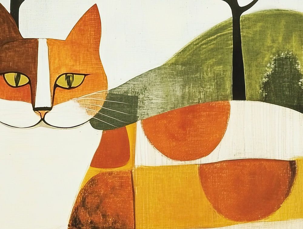 Détails : chat, peinture chat, art moderne, peinture animalière, vert, fleurs, arbres, abstrait, coloré, stylé