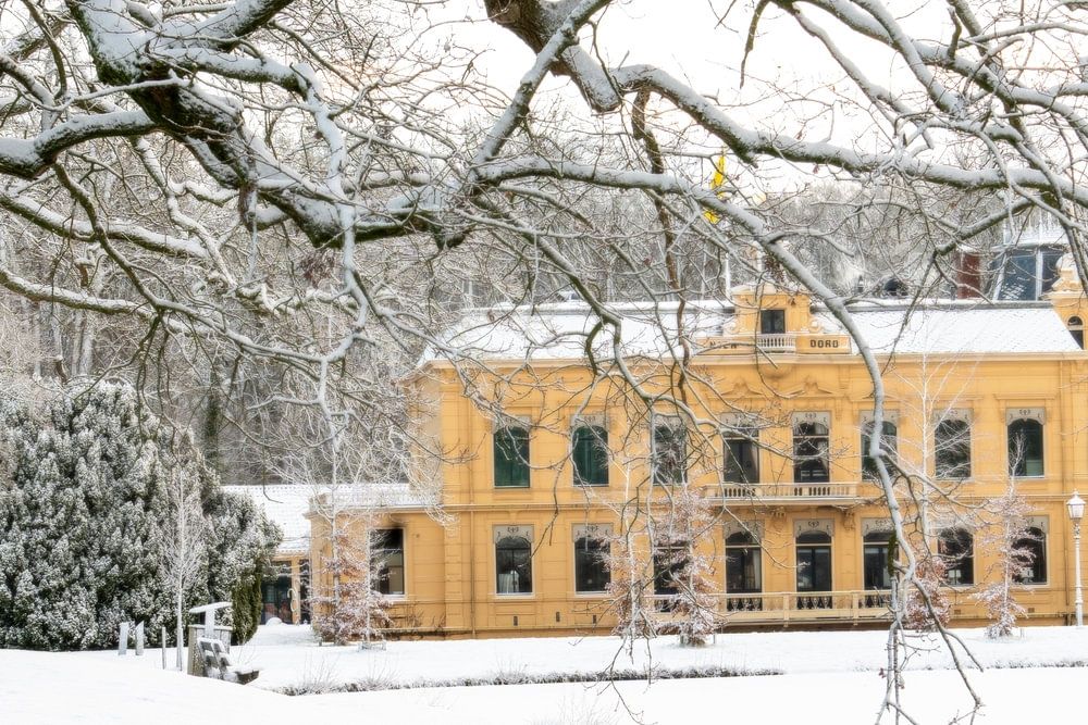 Château de Nienoord à Leek sous la neige. Au premier plan, l'étang et une branche en surplomb.