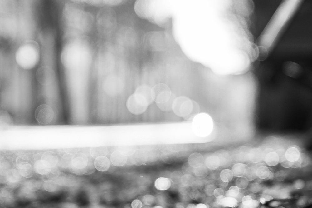 Chemin d'obus avec banc sur le Lange Voorhout à La Haye, Pays-Bas. Photo en noir et blanc. Contexte avec bokeh