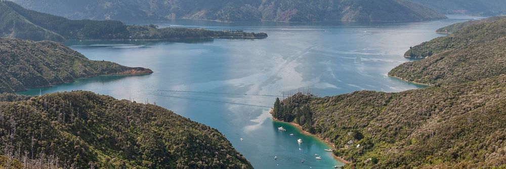 Piste de randonnée/cyclisme. Piste de la Reine-Charlotte. Queen Charlotte Trail Nouvelle-Zélande Vue le long de la baie des nombreuses criques Miritu Bay