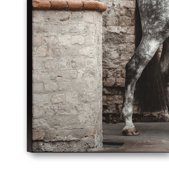 Beau portrait d'un cheval espagnol posant devant une vieille porte dans une église monumentale. Ce cheval espagnol appartient au stud-book espagnol PRE (Pura Raza Espanola). Le cheval est magnifiquement dessiné avec la robe de base blanche et le poil de pomme gris, et la crinière et la queue noires lui donnent une apparence spéciale. La photo de ce cheval unique dans cet endroit spécial est une belle œuvre d'art sur n'importe quel mur.