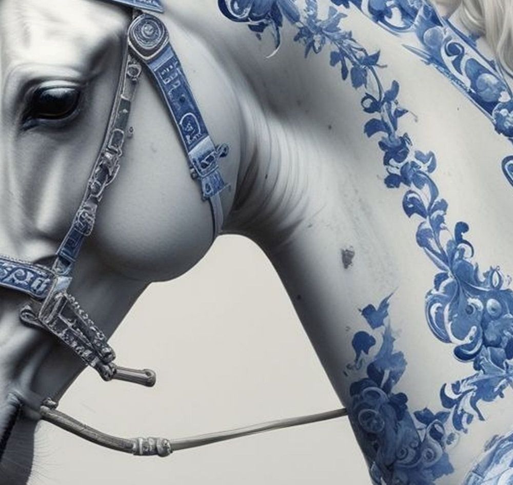 Art moderne bleu de Delft richement décoré d'un noble cheval blanc regardant de côté sur un fond blanc calme.