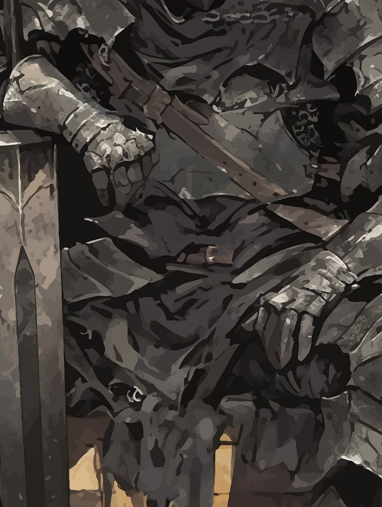 Plan d'ensemble d'un personnage sombre en armure, probablement un chevalier ou un soldat, assis, appuyé sur une épée.