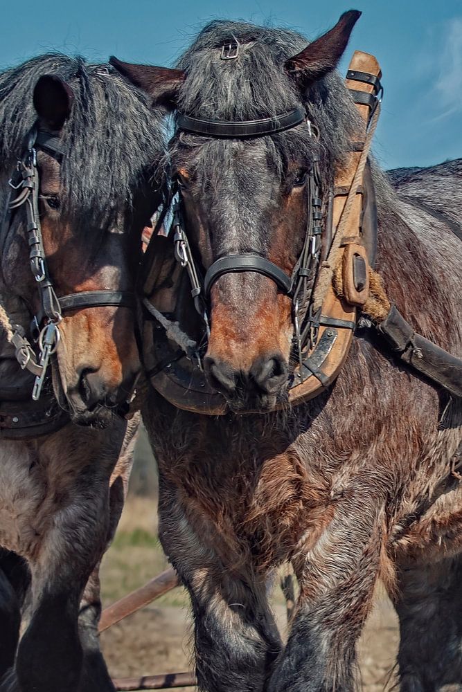 Deux chevaux de trait de Zeeland se reposent après avoir travaillé la terre.