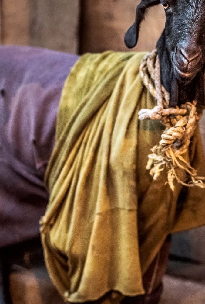 Dès que les températures baissent, toutes les chèvres de New Delhi mettent un pull. Cette chèvre porte une belle combinaison d'or et de violet, ce qui lui donne un air royal. J'ai pris la photo sur un marché couvert quand le soleil s'est couché. Cela m'a permis d'utiliser la combinaison de la douce lumière naturelle du soleil et des lampadaires qui venaient de s'allumer. Je trouve que c'est un défi d'exposer mes photos aussi bien que possible avec la lumière disponible. Cela rend les images spontanées, mais leur donne aussi une touche cinématographique.