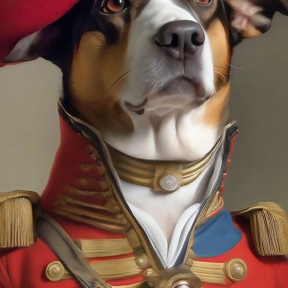Une statue amusante d'un chien habillé en Napoléon dans des couleurs amusantes.