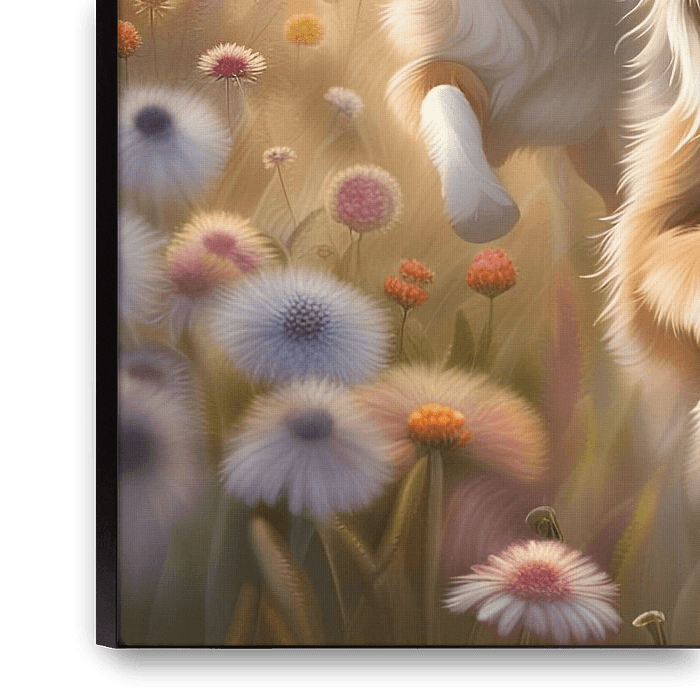 Cette œuvre d'art numérique vibrante et fantaisiste capture la joie de chiens bergers australiens jouant dans un champ de fleurs sauvages. L'expression enjouée et le langage corporel énergique du chien sont parfaitement capturés, et les couleurs vives et joyeuses des fleurs créent un sentiment de bonheur et d'insouciance.