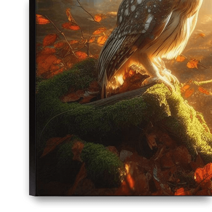 Une chouette effraie fantaisiste dans une forêt d'automne. Le soleil brille entre les arbres, donnant une couleur chaude aux feuilles d'automne sur le sol.