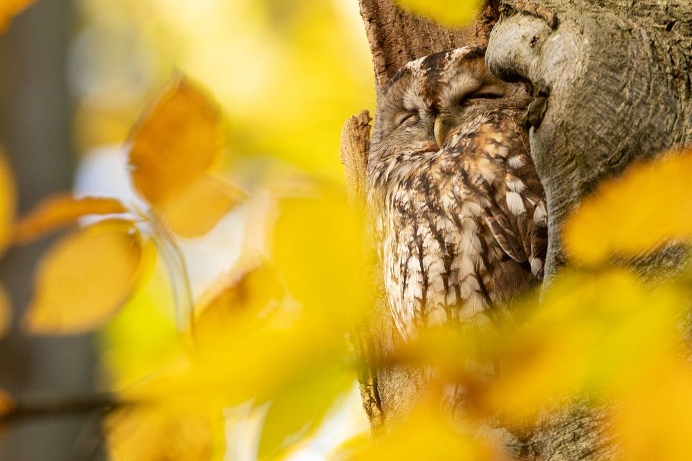 Chouette hulotte endormie dans une forêt d'automne par Jasper Kok