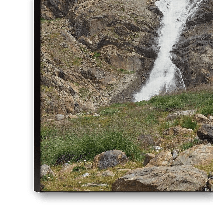 A propos de "Chutes d'eau en montagne - une photographie spectaculaire de la nature, pleine d'énergie et de force. Acheter maintenant une peinture murale ou une toile et découvrir l'eau de montagne."