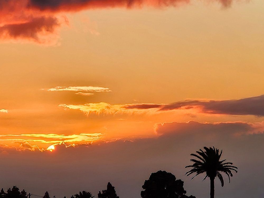 Le ciel est baigné de couleurs vives - du rouge profond à l'orange doux, en passant par le rose délicat et le violet. Ces couleurs se fondent harmonieusement les unes dans les autres et créent un décor de rêve qui fascine le spectateur. Des nuages sont disséminés dans le ciel et reflètent la lumière du soleil couchant, ce qui les fait apparaître comme des œuvres d'art flamboyantes.