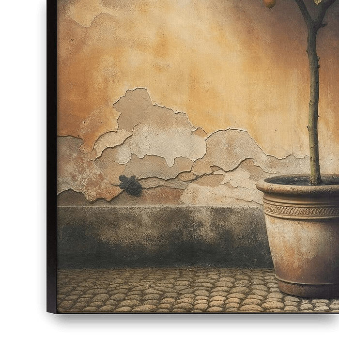 Un citronnier en pot, présenté comme une nature morte rustique méditerranéenne, exsude le charme authentique de la vie méditerranéenne. Les verts riches des feuilles et les citrons jaunes ensoleillés donnent à la pièce un aspect vibrant et naturel, tandis que les tons terreux du pot créent un équilibre rustique.