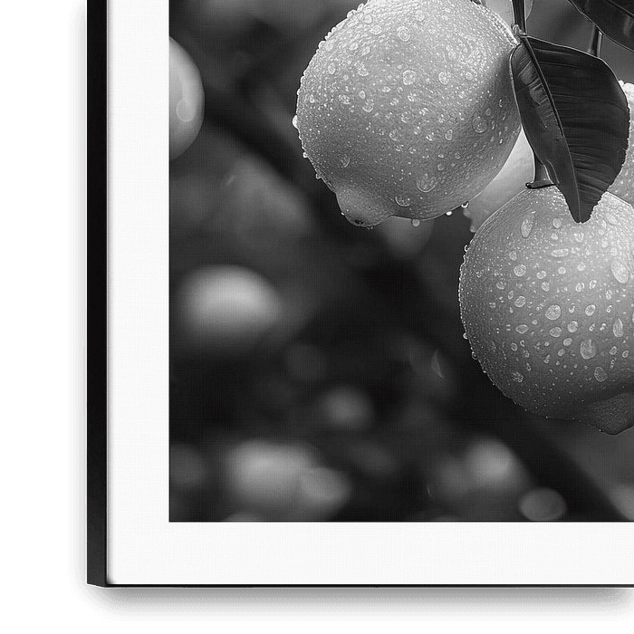 Un gros plan de citrons mûrs sur un arbre, recouverts de gouttes d'eau, photographiés en noir et blanc.