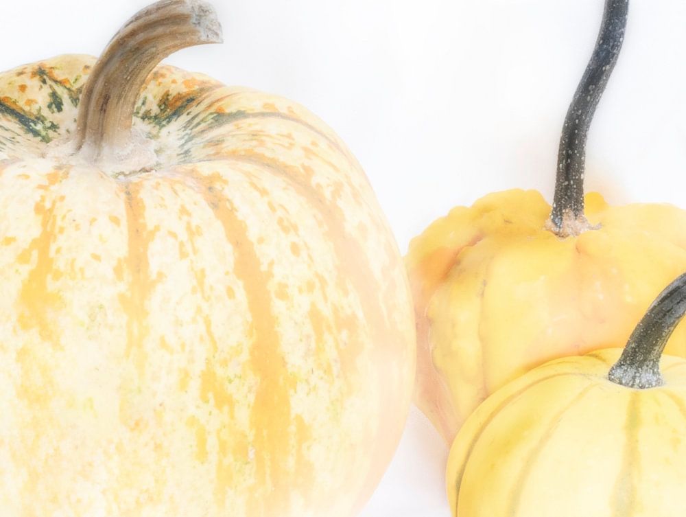 L'image montre trois citrouilles, magnifiquement éclairées dans un style High-Key. Elles sont placées sur un fond blanc uni qui est presque entièrement sur-éclairé, ce qui donne l'impression que les citrouilles sont détachées de leur environnement. Les couleurs des citrouilles - allant de l'orange doux au jaune chaud - contrastent subtilement avec le cadre lumineux, sans que l'image ne perde de sa douceur. Les ombres sont minimales et diffuses, laissant l'accent sur les formes, la texture et la couleur des citrouilles. L'ensemble est frais, minimaliste et presque rêveur.