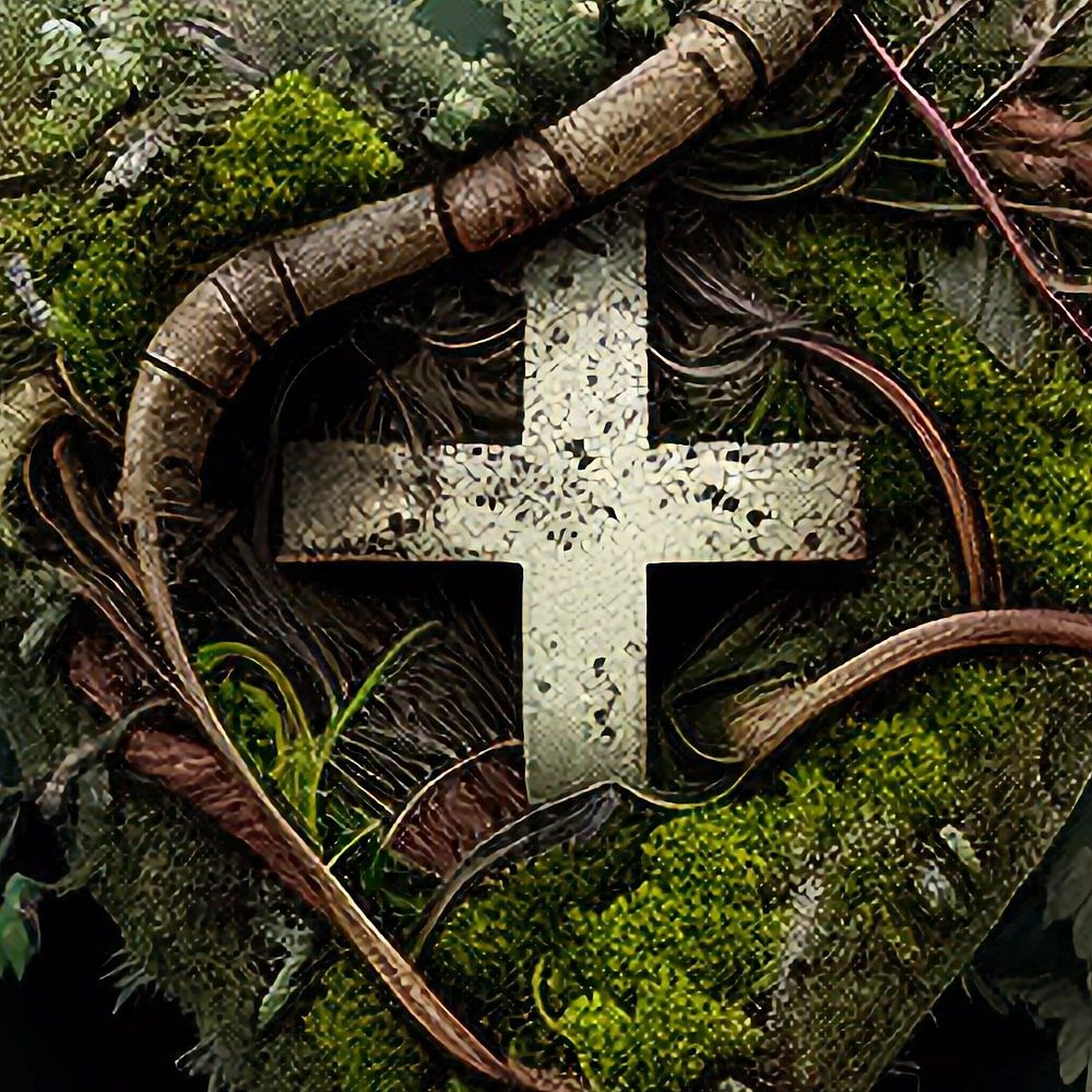 Cœur sacré de la nature présente une composition en forme de cœur de feuillage vert intense, de branches entrelacées et de mousse vivante, le tout entourant une croix blanche centrale. Les matériaux organiques et la disposition symbolique créent une puissante déclaration visuelle de foi, d'unité et de beauté de la création - idéale pour les collectionneurs d'art spirituel ou les espaces sacrés inspirés par la nature.