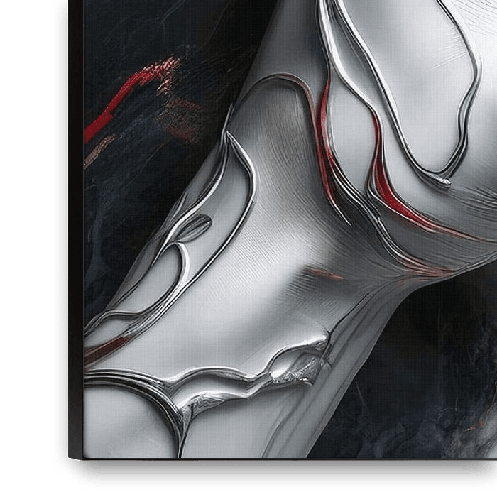 Le fond ouvre un espace abstrait d'une grande profondeur. Sur un fond noir doux, des veines ondulantes d'or, d'argent et de rouge s'écoulent. Elles évoquent le marbre avec des inclusions métalliques ou des courants énergétiques qui traversent et animent l'espace. Cette structure en mouvement renforce le champ de tension entre le froid et le chaud, entre le contrôle et l'émotion.