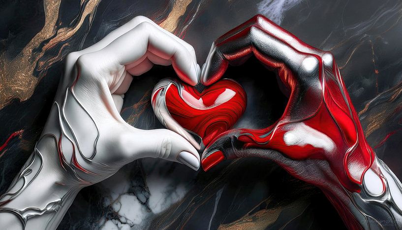 Au centre de cette œuvre, deux mains se rencontrent dans un geste silencieux mais percutant. De ce contact naît la forme d'un cœur - un signe archétypal de l'attachement, de la proximité et de l'équilibre fragile des relations humaines. La main gauche, toute de blanc froid, fait face à la main droite, en argent et rouge ardent.…