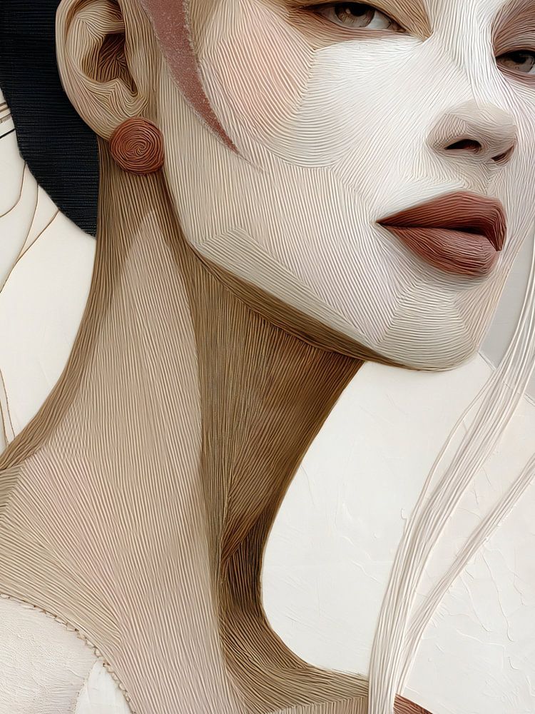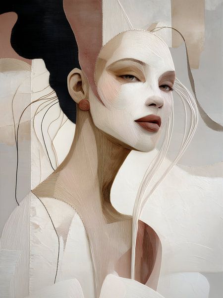 Portrait d'une femme réalisé dans un style collage, avec de la ficelle, du papier, de la peinture et des éléments de dessin au trait dans des tons naturels.