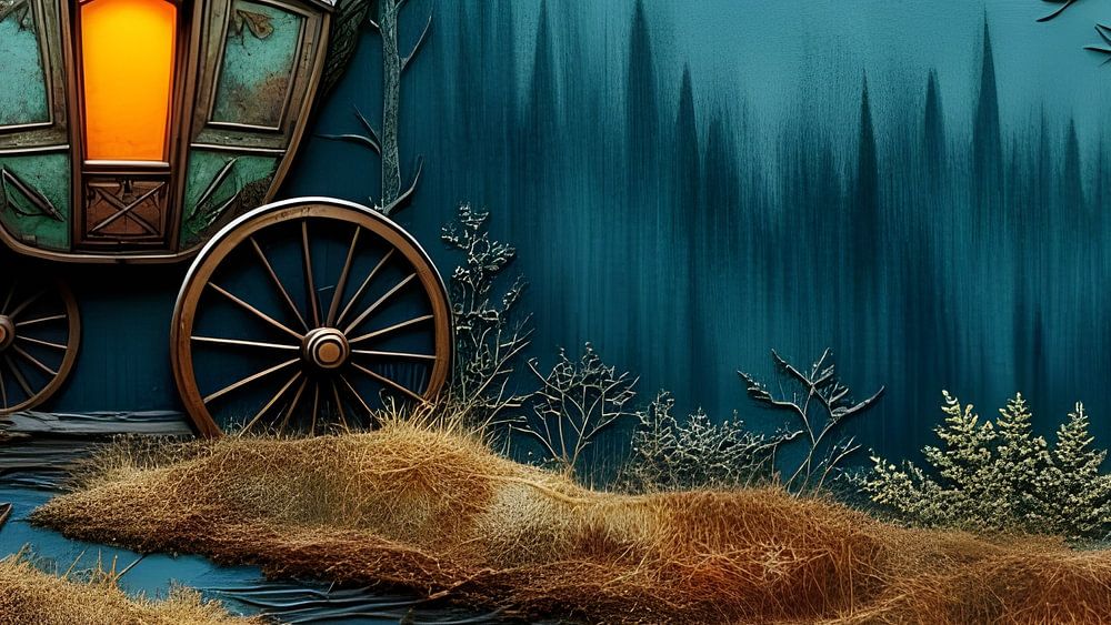 une roulotte décorée se tient seule dans une forêt nocturne - collage